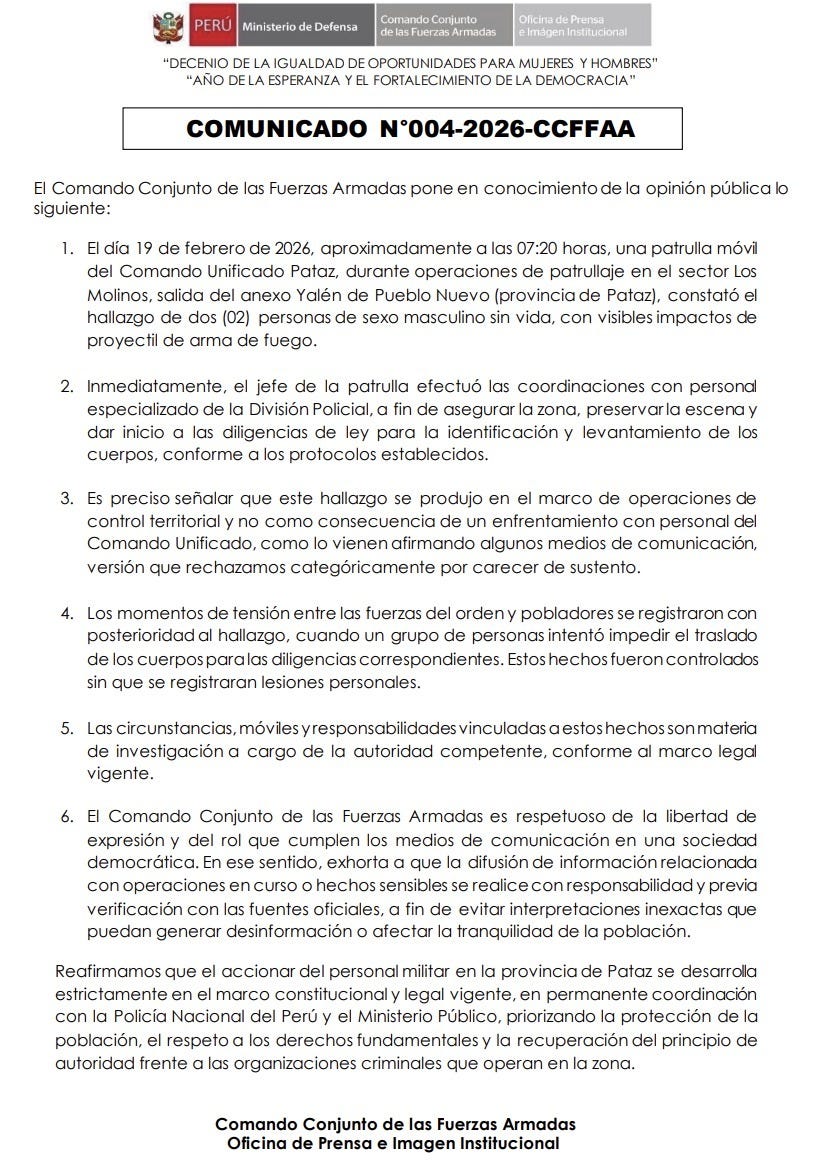 En un comunicado, el Comando Conjunto informó que alrededor de las 7:20 a.m. de ayer, jueves, una patrulla móvil del Comando Unificado de Pataz constató el hallazgo de dos personas de sexo masculino sin vida, "con visibles impactos de proyectil de arma de fuego".