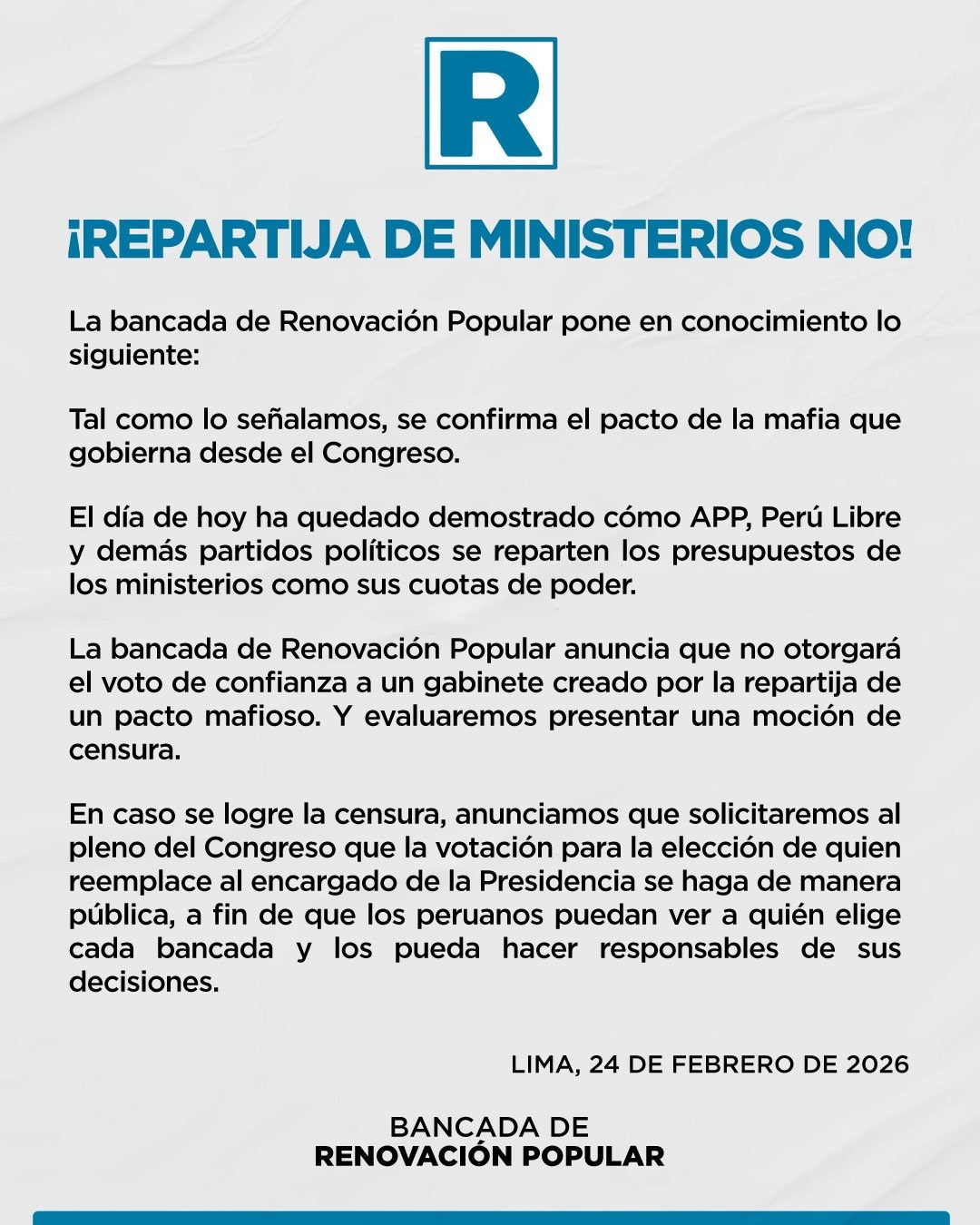 La bancada de Renovación Popular anunció este martes que no le dará el voto de confianza al gabinete liderado por Denisse Miralles porque aseguran que entre algunos partidos políticos se han repartido los ministerios.