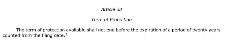 Por otro lado, el Perú también es miembro de la Organización Mundial del Comercio, y en el artículo 33 del Acuerdo sobre los Aspectos de los Derechos de Propiedad Intelectual Relacionados con el Comercio, indica que las patentes tienen 20 años de vigencia.