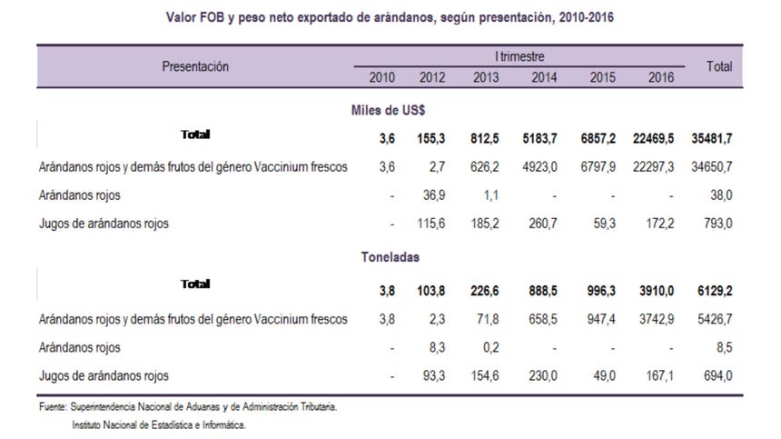 El Perú ya exportaba arándanos desde al menos el año 2010, según registros del Instituto Nacional de Estadística e Informática (INEI), con información de la Superintendencia Nacional de Aduanas y de Administración Tributaria (Sunat). Ese año, el valor exportado fue de aproximadamente US$32 000.