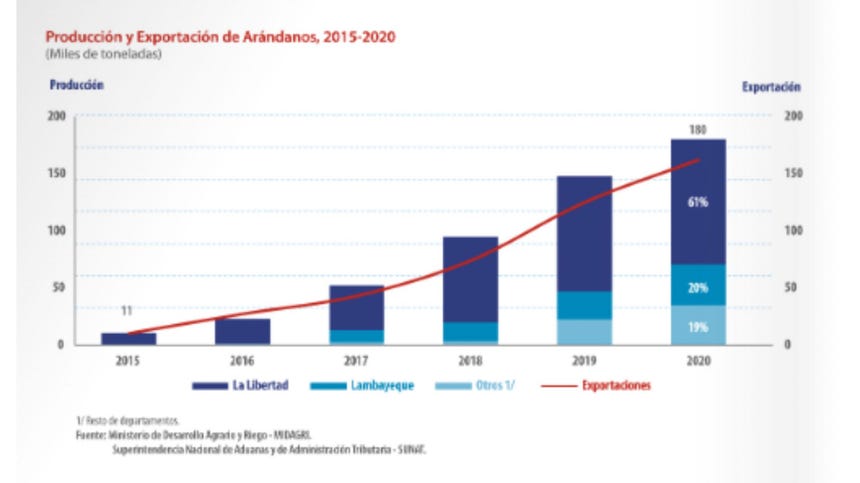 El crecimiento fue rápido. Para el 2015, las exportaciones de arándanos ya alcanzaban los US$96.8 millones. Es decir, antes del periodo al que se refirió el candidato, el producto ya había pasado de ser una actividad emergente a convertirse en un negocio en plena expansión, según el INEI.