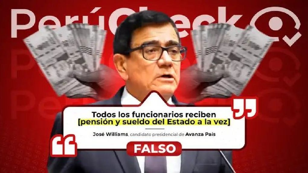 José Williams, candidato presidencial de Avanza País, indicó que todos los funcionarios públicos pueden percibir doble ingreso del Estado. Pero la Constitución y la Ley Marco del Empleo Público señalan que está prohibido que los funcionarios públicos reciban doble ingreso de parte del Estado. Por este motivo, PerúCheck califica las declaraciones del candidato de Avanza País, José Williams, como falsas.