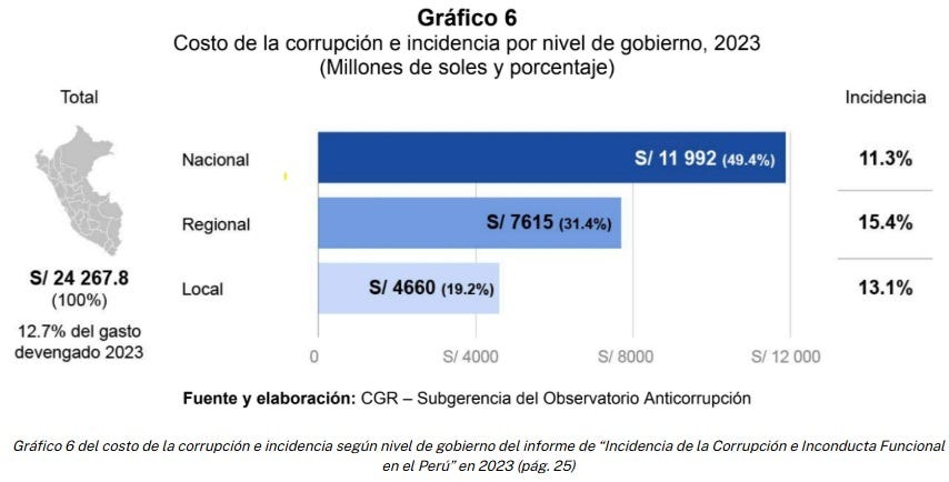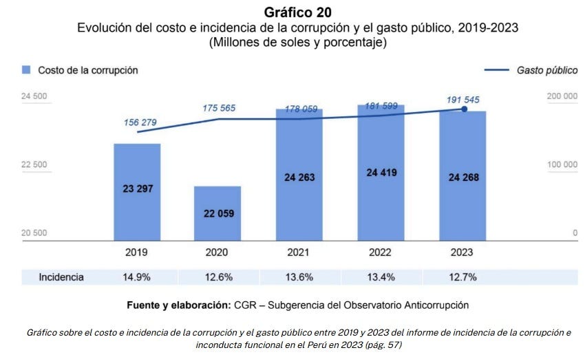 El costo extrapolado de la corrupción en el sector público durante 2023 ascendería a S/.24,268 millones, lo que equivale a 12.7 % del presupuesto público ejecutado ese año, de acuerdo con el último informe de ‘Estimación del perjuicio económico ocasionado por la corrupción y la inconducta funcional’, publicado por la Contraloría General de la República (CGR).