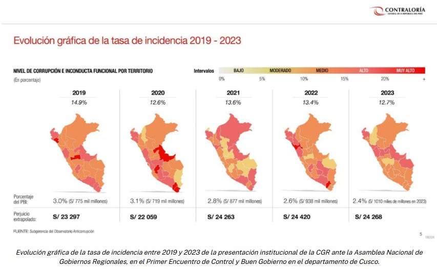Asimismo, según la presentación institucional ante la Asamblea Nacional de Gobiernos Regionales en marzo de 2024, la Contraloría consignó nuevamente que el perjuicio extrapolado en 2023 fue de S/.24,268 millones y que ninguna región en ese entonces mostraba un nivel “muy alto” de corrupción e inconducta funcional.