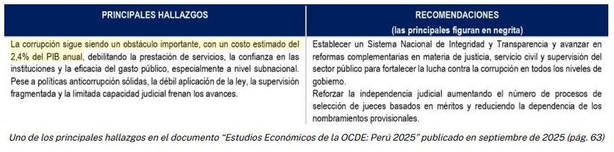La Organización para la Cooperación y el Desarrollo Económico (OCDE) estima que la corrupción y la inconducta funcional representan un costo anual equivalente al 2.4% del PBI del Perú, lo que impacta la calidad de los servicios públicos y la infraestructura.