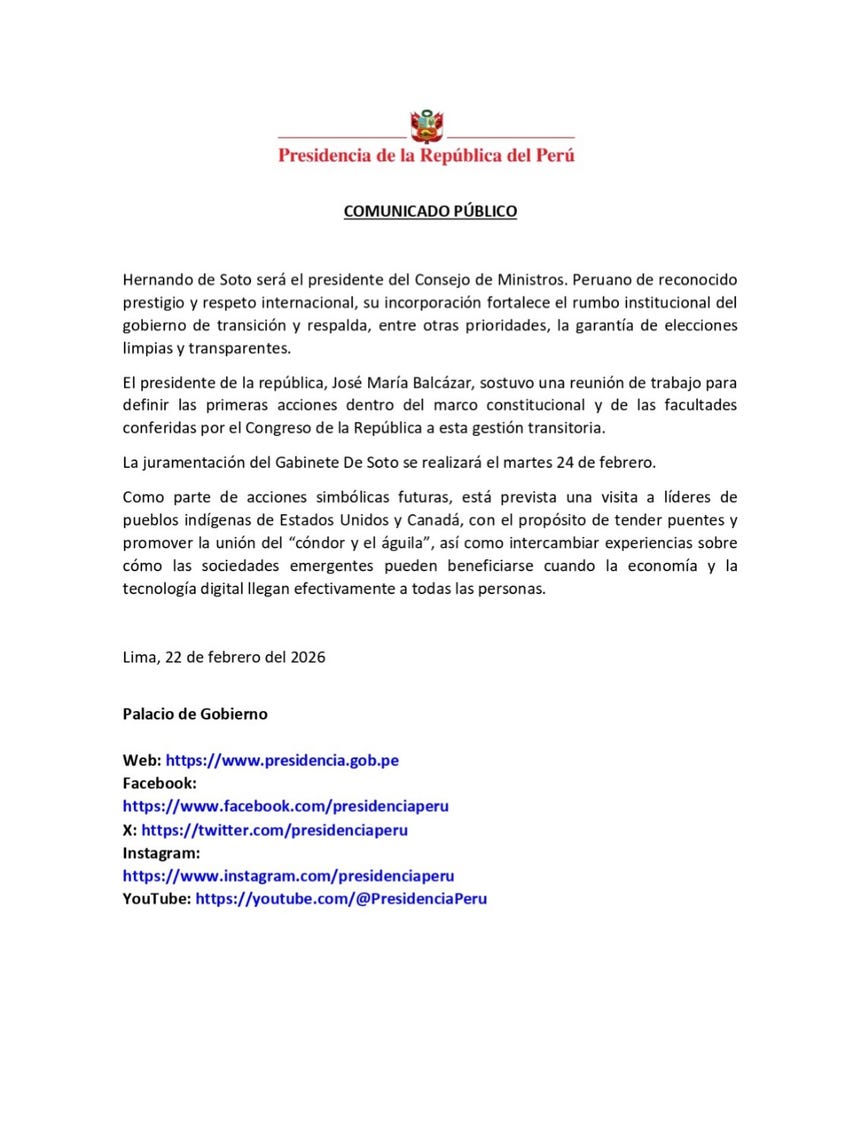 En el comunicado también se dio a conocer que la juramentación de Hernando de Soto y el resto de ministros será este martes 24 de febrero.