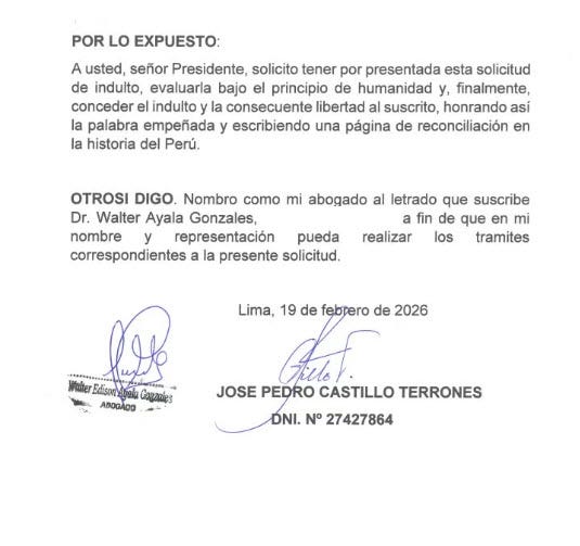 “Cumplir su palabra de indultarme no solo sería un acto de justicia conmigo, sino un gesto poderoso que reivindicaría la confianza en la clase política. Los peruanos están cansados de promesas incumplidas. Usted tiene la oportunidad histórica de demostrar que, a diferencia de otros, cumple los acuerdos”, enfatizó.
