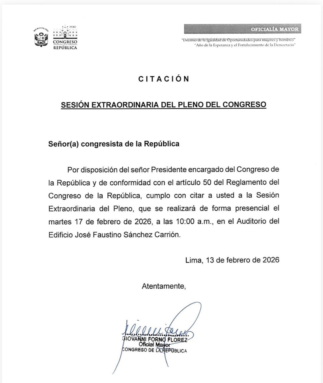 "Los promotores de la moción de censura, que cometieron varios errores, los han subsanado y acaban de presentar la moción en SIETE partes distintas (no es lo regular, pero se ha aceptado), con 78 firmas, justo el mínimo necesario. En consecuencia, coordinando con la Mesa Directiva, he dispuesto que se convoque a un pleno extraordinario para discutir la censura del presidente José Jerí, el martes 17 a las 10 am", escribió el titular del Congreso en su mensaje.