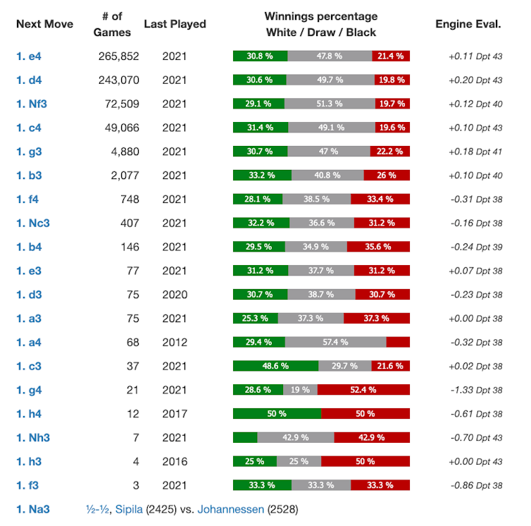 Se puede observar que la apertura utilizada con mayor frecuencia entre los grandes maestros es 1.e4, con más de 250 000 partidas jugadas, mientras que la que obtiene un mayor porcentaje de éxito es 1.h4, una apertura que apenas se ha jugado en 12 ocasiones, pero donde las blancas han ganado el 50 % de las veces. Conocer con exactitud cuál es la distribución de los resultados en función de las aperturas jugadas puede ser una información muy relevante para decidir jugar unos u otros movimientos.