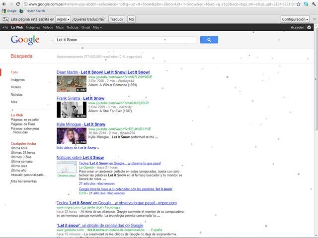Al escribir la frase "Let it snow" en la barra de búsqueda de Google, comienzan a caer copos virtuales de nieve en la pantalla del monitor. Un divertido truco por Navidad.