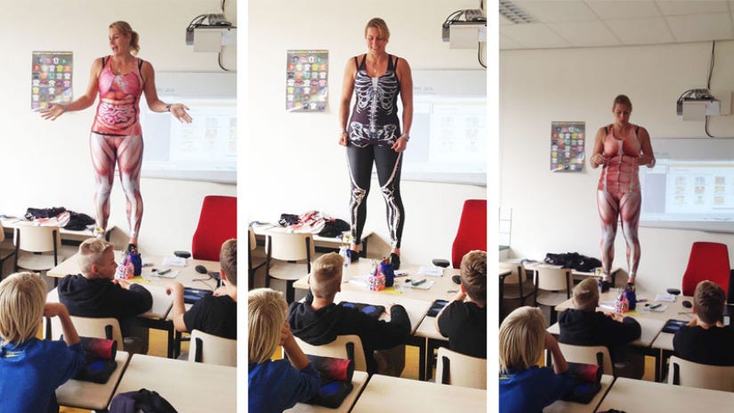 En el video, la profesora estaba vestida con un traje que imitaba los músculos y órganos humanos lo que la ha convertido en una heroína para la comunidad docente.