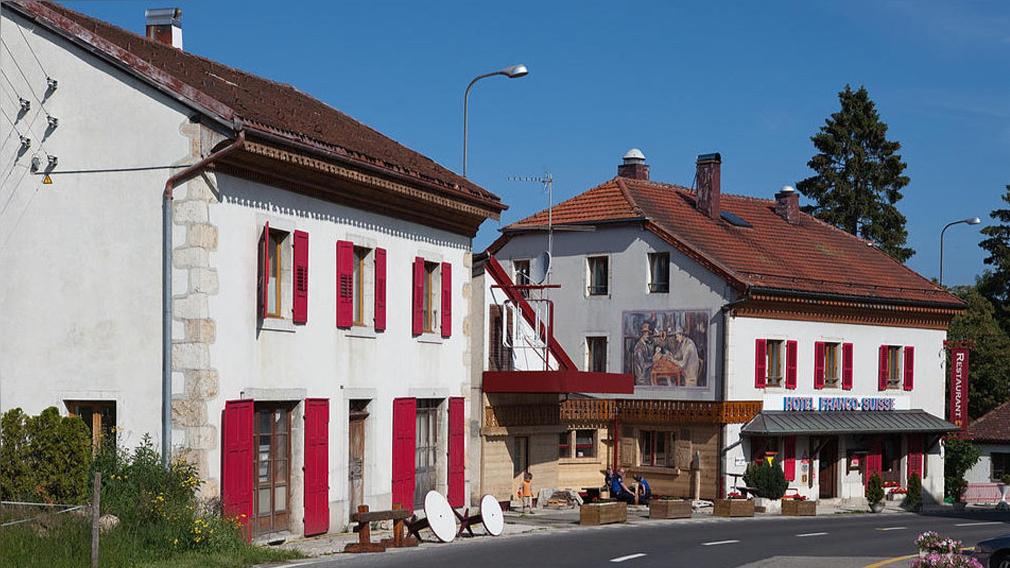 El Hotel Arbez se encuentra en el pueblo francés de La Cure y atraviesa la frontera entre Francia y Suiza.